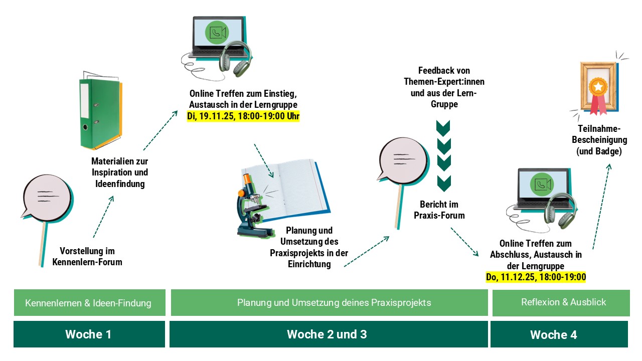 Der Online-Workshop erstreckt sich über vier Wochen. In der ersten Woche entwickelst du eine Idee für dein Praxisprojekt, das du in den Wochen zwei und drei in deiner Einrichtung umsetzt. In der vierten Woche reflektierst du das Projekt. Insgesamt gibt es zwei Online-Treffen (Mittwoch, 19.11.2025 von 18:00 bis 19:00 Uhr und Donnerstag, 11.12.2025 von 18:00 bis 19:00 Uhr), die dem Austausch und der Vernetzung dienen. Während des gesamten Prozesses wirst du von Themen-Expert:innen der Stiftung begleitet und erhältst kontinuierliches Feedback. Für die Vorbereitung, Durchführung und Nachbereitung des Projekts solltest du etwa 12 Stunden einplanen.